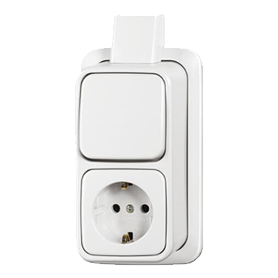 Busch Jaeger opbouw wisselschakelaar + wandcontactdoos (WCD). Uitgevoerd in wit (RAL9010) en voorzien van randaarde. Inclusief montageplaat en adapter voor een platte buis (K-25/P-25). Nominale spanning: 250 V~ Nominale stroom: 16 A Nominale stroom: 10