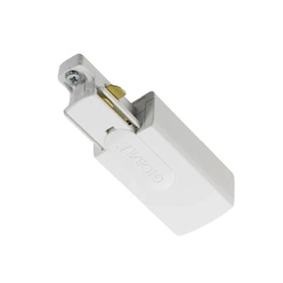 Global Trac Base spanningsrail aansluitblok, 1-fase, aarde links, wit (RAL 9016). De voedingsconnector voorziet het spanningsrail van stroom, onmisbaar in elke opstelling van Spanningsrails.